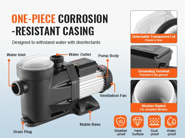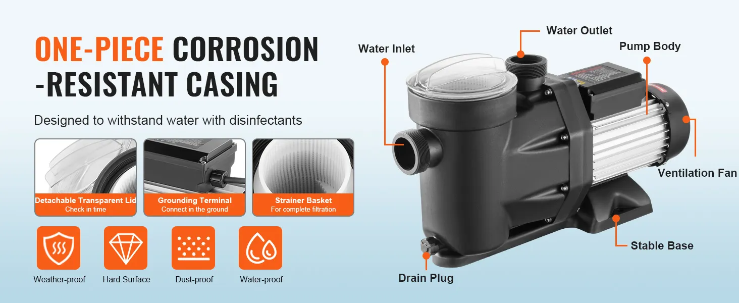 Onze zwembadpomp is voorzien van een verdikte PP-behuizing, ontworpen voor maximale duurzaamheid en uitzonderlijke corrosieweerstand. Het ventilatieontwerp verbetert de warmteafvoer en zorgt voor optimale prestaties.