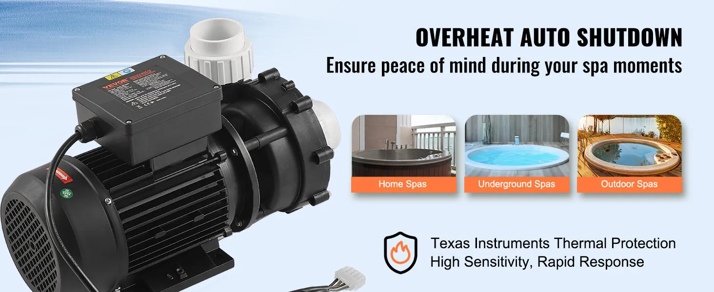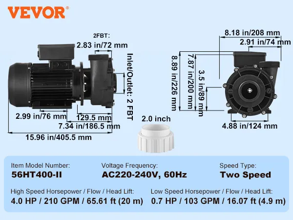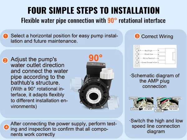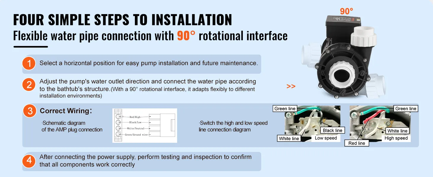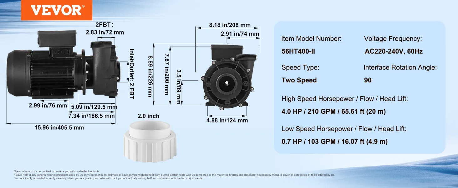Mainstream-pompmodel: Het 56 Frame Motor-pompmodel is een perfecte vervanging voor het OEM-model. We leveren ook twee 5 cm lange connectoren die op verschillende badkuipen passen. Houd er rekening mee dat de zwembadpomp afhankelijk is van het ingangsvermogen en niet van het uitgangsvermogen. Controleer vóór aankoop de parameters van uw oude pomp.
