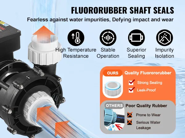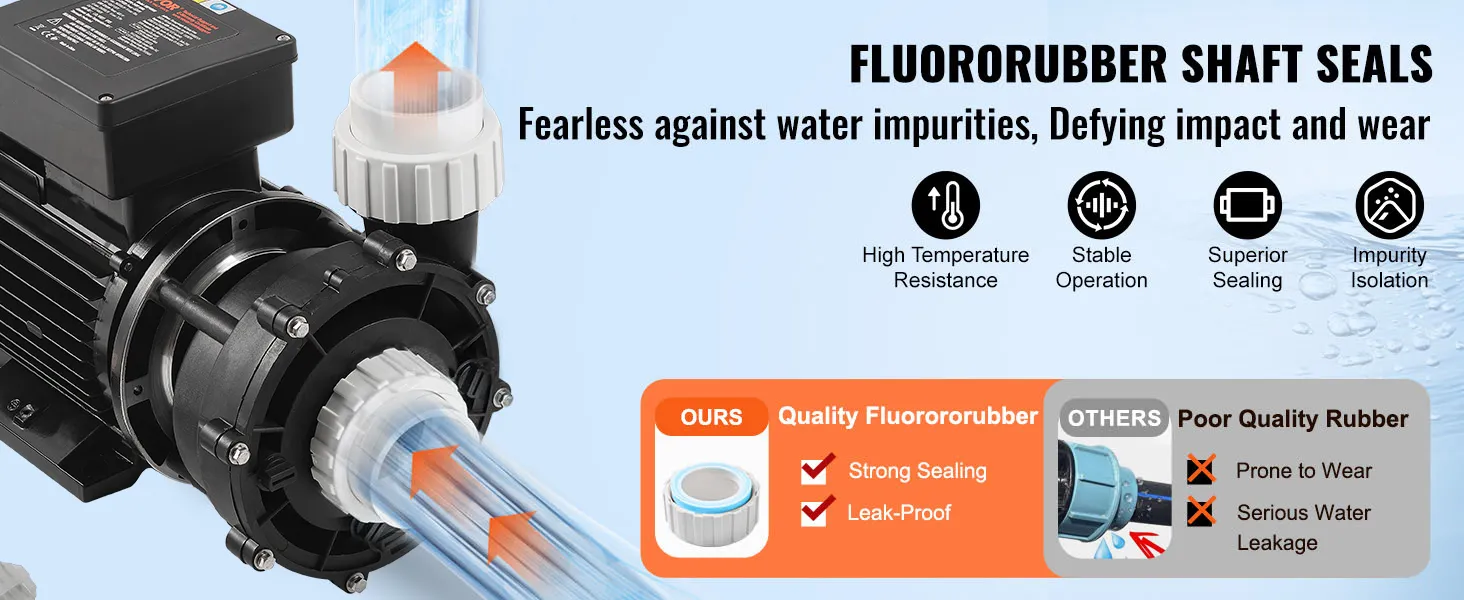 Afdichting tegen lekkage: Lekkage is de sleutel tot de zwembadpomp, daarom gebruiken we alleen asafdichtingen van fluorrubber, die goed bestand zijn tegen hoge temperaturen, corrosie, olie en veroudering, en in staat zijn stabiele afdichtingsprestaties te behouden in zware werkomgevingen. Het voorkomt effectief het ontsnappen van vloeistoffen en deeltjes. U kunt genieten van verschillende soorten inweekmassages zonder dat u zich zorgen hoeft te maken over infiltratieproblemen.