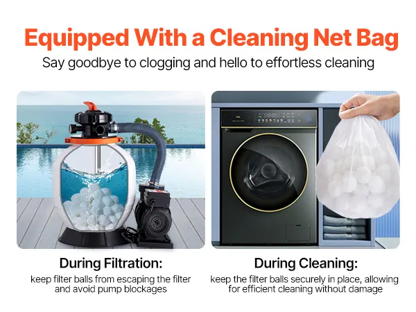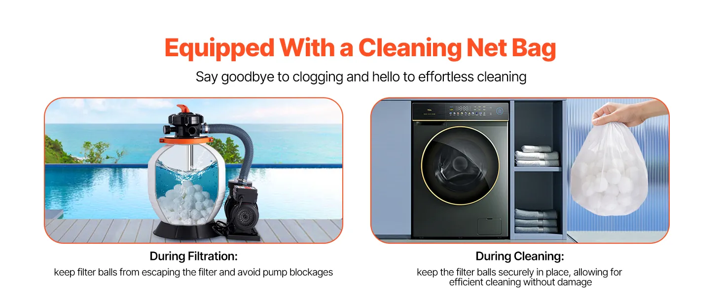 The filter balls for swimming pools come with a cleaning mesh bag, designed to be used with the filter balls, avoiding any clogging in your filtration system. No need to worry about blockages, just hassle-free filtration and maintenance.