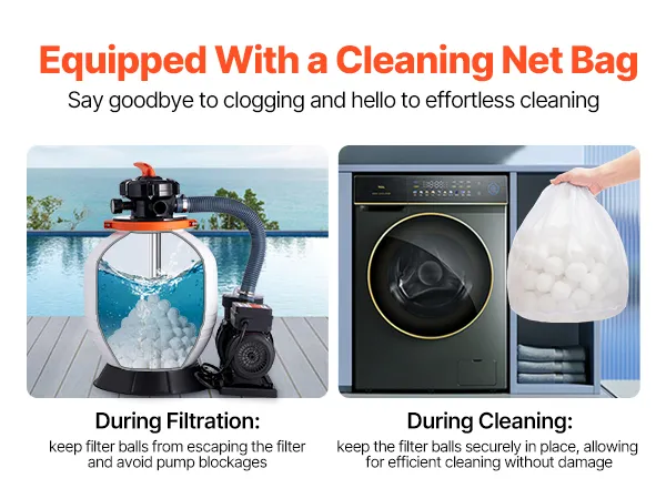 The filter balls for swimming pools come with a cleaning mesh bag, designed to be used with the filter balls, avoiding any clogging in your filtration system. No need to worry about blockages, just hassle-free filtration and maintenance.