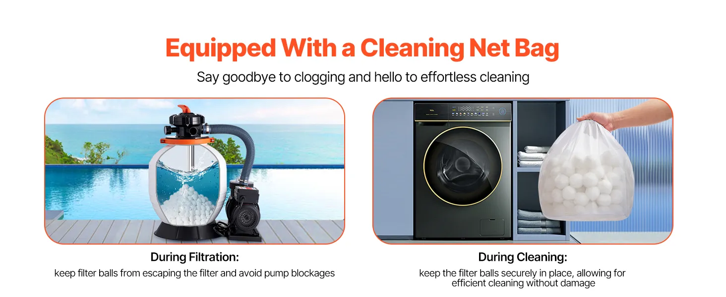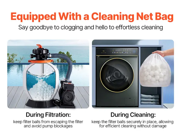 The filter balls for swimming pools come with a cleaning mesh bag, designed to be used with the filter balls, avoiding any clogging in your filtration system. No need to worry about blockages, just hassle-free filtration and maintenance.