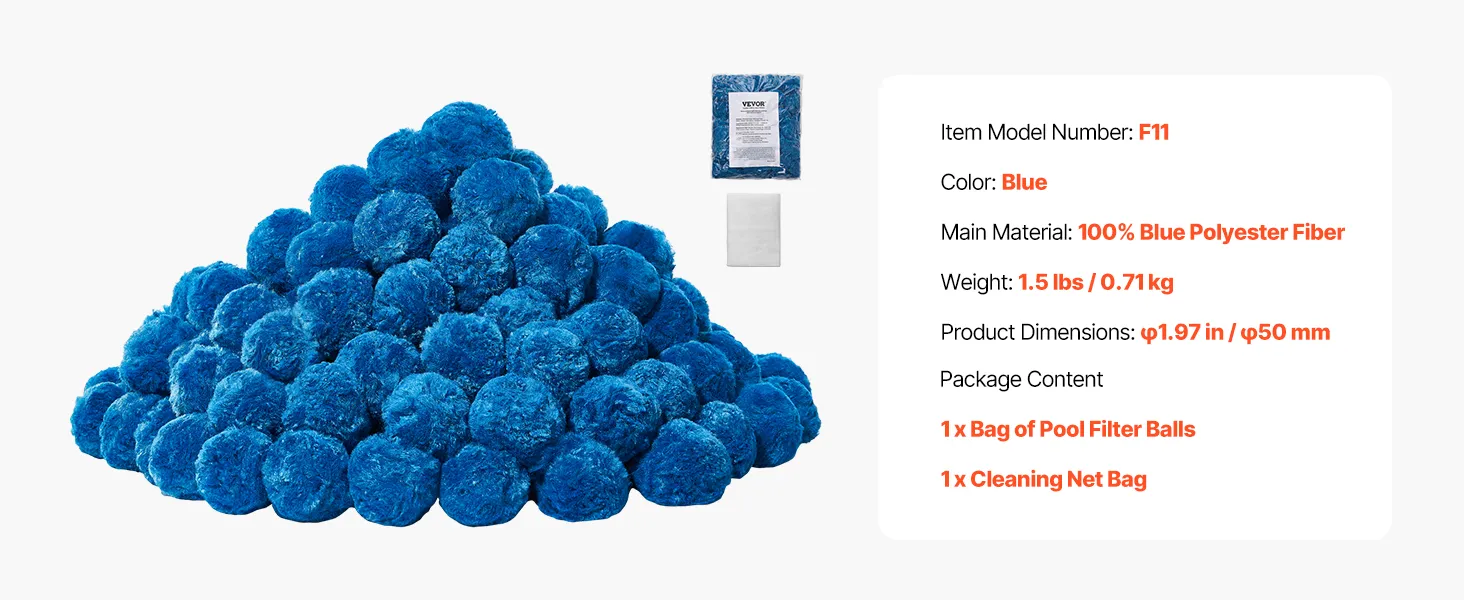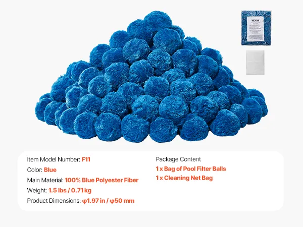 Elevate your filtration game with our pool filter balls, crafted from 100% blue polyester fiber. Our balls bring superior filtration performance, are compatible with various filter systems like sand filters, cartridge filters, and DE filters. Enjoy swimming in crystal clear water in no time!