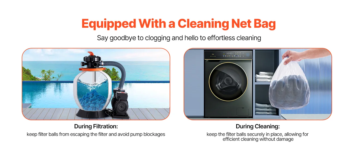 The filter balls for swimming pools come with a cleaning mesh bag, designed to be used with the filter balls, avoiding any clogging in your filtration system. No need to worry about blockages, just hassle-free filtration and maintenance.
