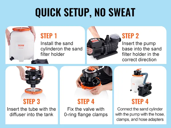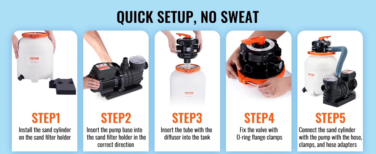 Onze zandfilterpomp is ontworpen met het oog op eenvoud en kent een eenvoudig installatieproces. Zelfs nieuwe gebruikers kunnen ze eenvoudig installeren zonder ingewikkelde stappen of speciaal gereedschap: gewoon aansluiten en klaar.