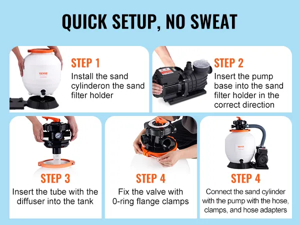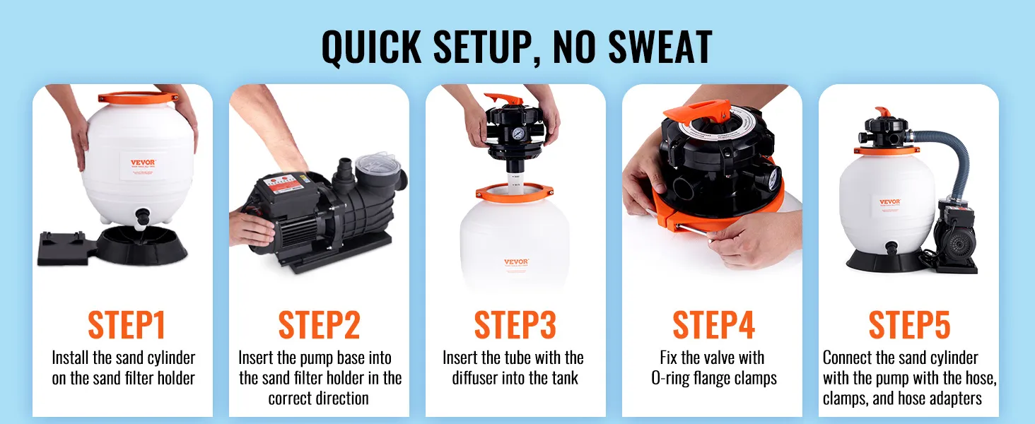 Onze zandfilterpomp is ontworpen met het oog op eenvoud en kent een eenvoudig installatieproces. Zelfs nieuwe gebruikers kunnen ze eenvoudig installeren zonder ingewikkelde stappen of speciaal gereedschap: gewoon aansluiten en klaar.