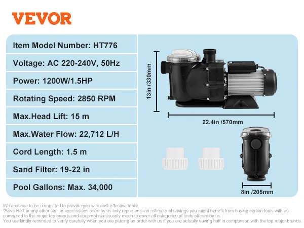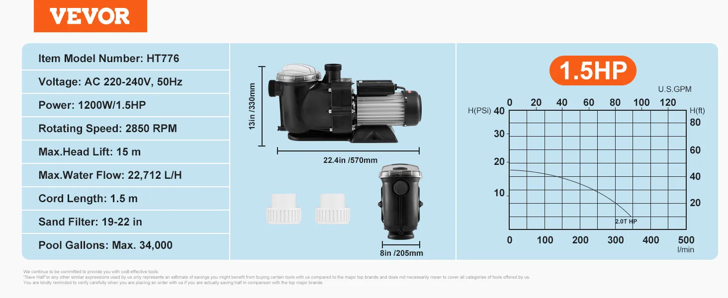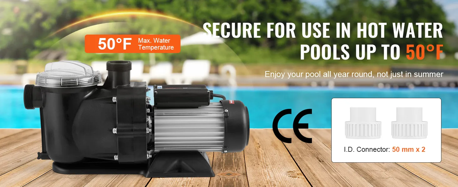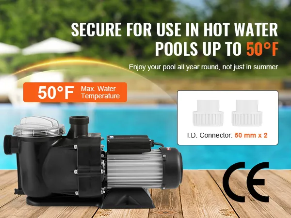 Deze spa-zwembadpomp is ontworpen voor watertemperaturen van 0 °C tot 50 °C (32 °F tot 104 °F), waardoor hij niet alleen geschikt is voor bovengrondse zwembaden, maar ook voor bubbelbaden, spa's (inclusief zoutwaterzwembaden) en Irrigatie systemen.