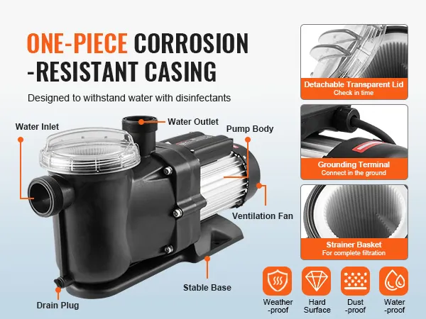 Efficiënt watercirculatiesysteem: Met een maximale waterstroom van 100 GPM en een maximale opvoerhoogte van 15 m zorgt onze zwembadpomp voor een snelle watercirculatie. Hun verwijderbare filtermand, compatibel met een zandfilter (niet inbegrepen), maakt de fysieke reiniging eenvoudiger en houdt uw zwembadwater kristalhelder. Dankzij de PVC-afdekking kunt u nauwlettend in de gaten houden wanneer de mand moet worden schoongemaakt. Geniet elke keer van een consistent onberispelijke zwembadvloer!