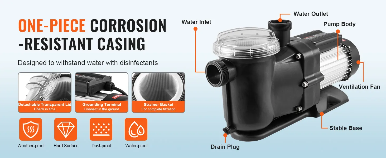 Corrosiebestendig verdikte behuizing: In tegenstelling tot andere pompen heeft onze zwembadpomp een PP-behuizing die bestand is tegen schadelijke stoffen. Dankzij de geïntegreerde structuur beschikt het over lekvrije, slijtvaste eigenschappen en zorgt het voor duurzaamheid, zelfs bij het omgaan met water dat is behandeld met ontsmettingsmiddelen. Dompel uzelf onder in zorgeloos zwembadonderhoud met onze pomp!