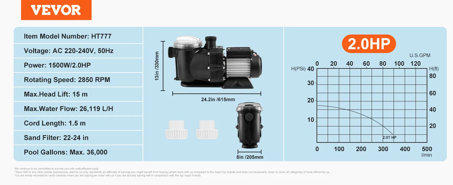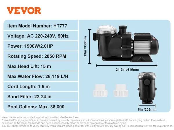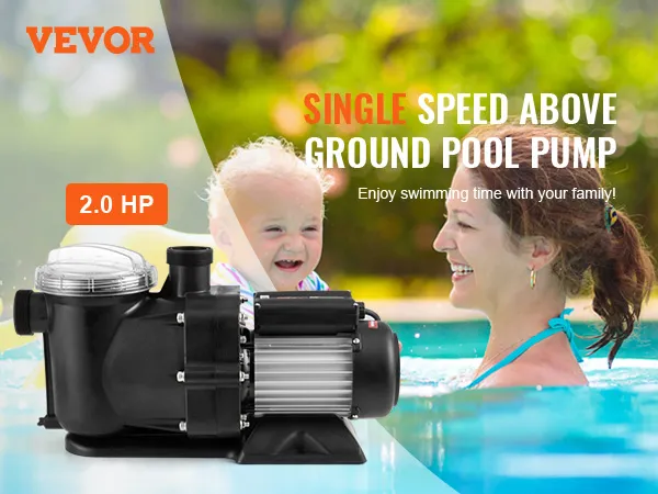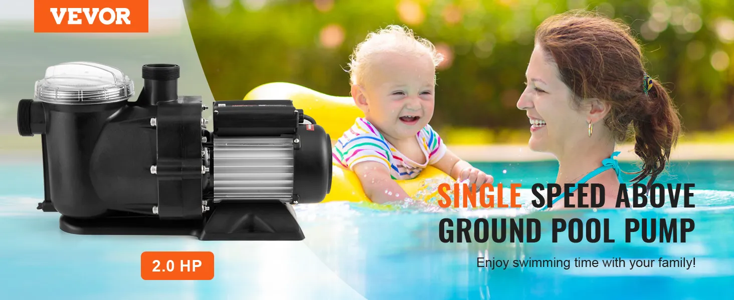 Premium koperen motor van 2 pk: spanning: 220-240 V, 50 Hz Gecombineerd met een aluminium motorbehuizing zorgt onze puur koperen motor voor een efficiënte en stabiele werking en heeft hij ingebouwde thermische beveiliging. Onze bovengrondse zwembadpomp is de perfecte keuze voor het filteren van circulerend water. Zeg vaarwel tegen troebel zwembadwater en hallo tegen sprankelende helderheid met onze zwembadpomp!