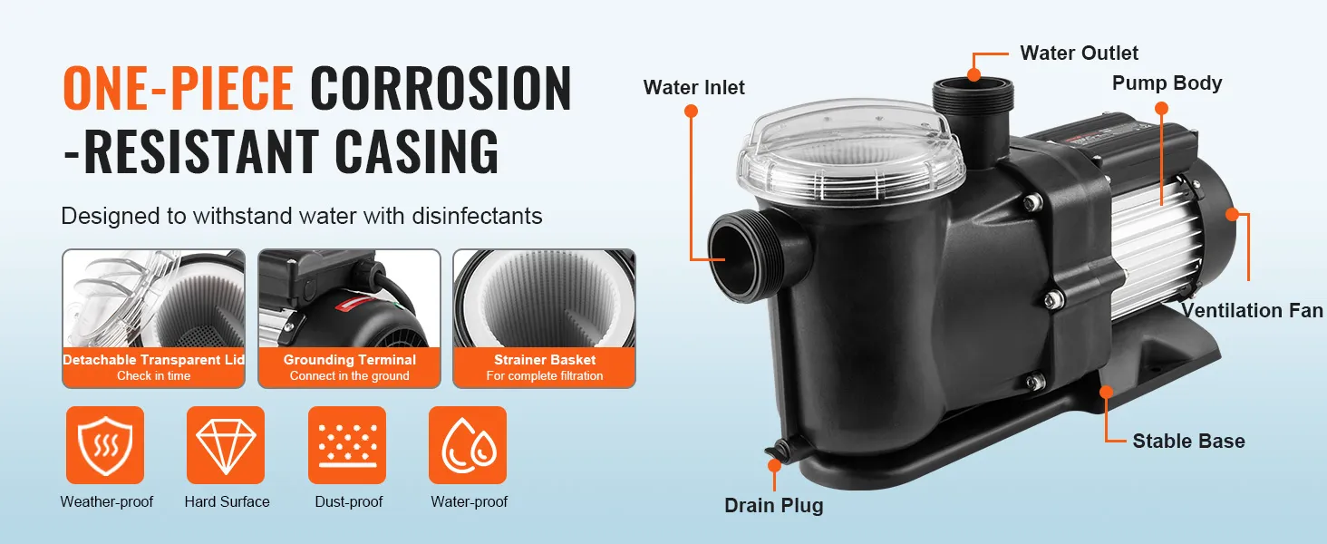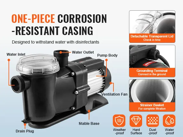Corrosiebestendig verdikte behuizing: In tegenstelling tot andere pompen heeft onze zwembadpomp een PP-behuizing die bestand is tegen schadelijke stoffen. Dankzij de geïntegreerde structuur beschikt het over lekvrije, slijtvaste eigenschappen en zorgt het voor duurzaamheid, zelfs bij het omgaan met water dat is behandeld met ontsmettingsmiddelen. Dompel uzelf onder in zorgeloos zwembadonderhoud met onze pomp!