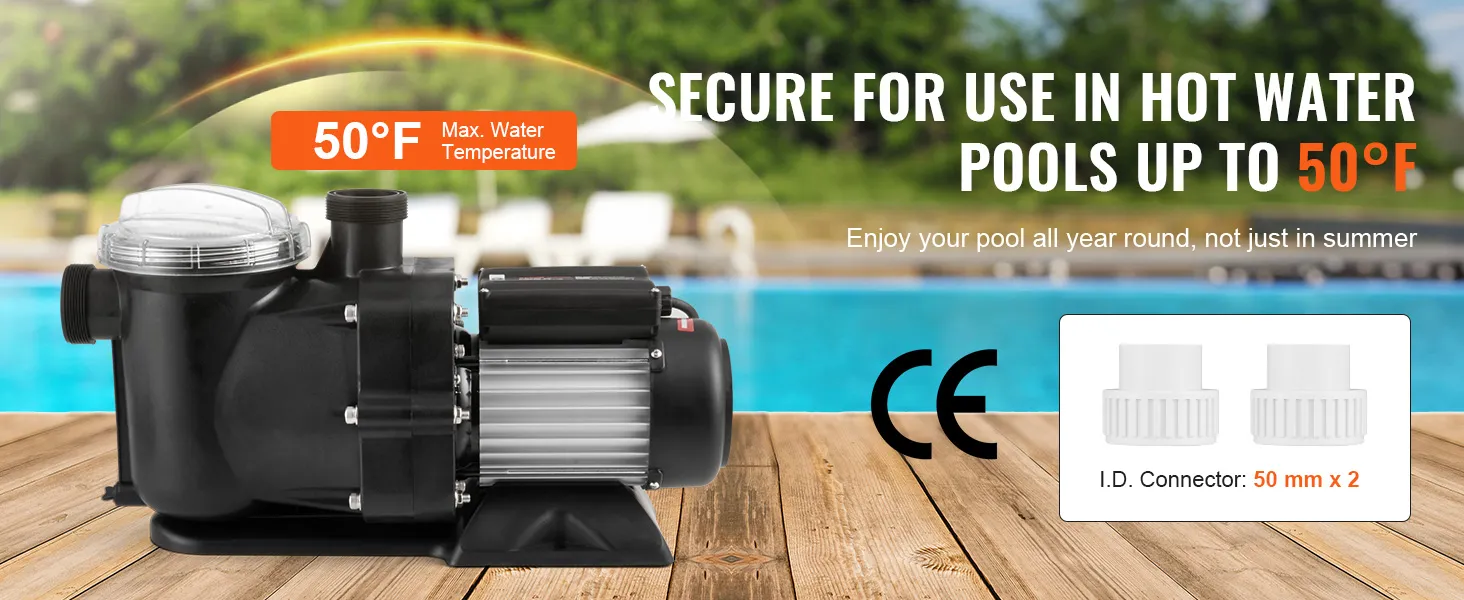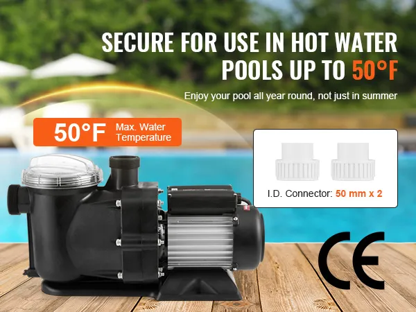 Deze spa-zwembadpomp is ontworpen voor watertemperaturen van 0 °C tot 50 °C (32 °F tot 104 °F), waardoor hij niet alleen geschikt is voor bovengrondse zwembaden, maar ook voor bubbelbaden, spa's (inclusief zoutwaterzwembaden) en Irrigatie systemen.