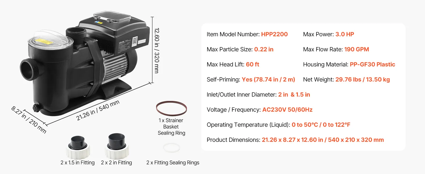 With 2200W max power, 18 m max head, 43,000 L/H max flow, and 1150 to 3600 RPM variable speed control, this pool pump delivers strong circulation and high-efficiency filtration to keep your pool water clean and clear.