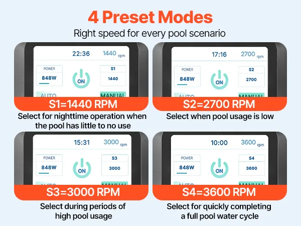 High-Efficiency Filtration: With a 2200W max power, 18 m max head, 43,000 L/H max flow rate, 1150-3600 RPM variable speed control, and 4 preset modes, this in / above ground pool pump provides efficient filtration to keep your water crystal clear