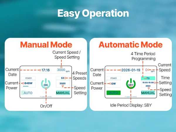 The LCD display on this in / above ground pool pump shows real-time status, while 4 preset modes, one-touch selection, and 24-hour automatic operation make daily use simple and convenient.