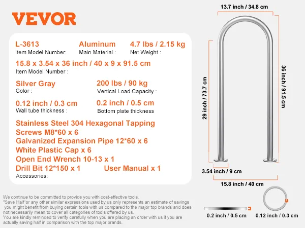 VEVOR Pool Handrail,36 x 13 inch Pool Railing, Aluminum with Base Plate for Indoor/Outdoor Pools, Humanized Swimming Pool Safety Railing for Decks, Rust-Proof Grab Bar with Accessories for Spas Docks