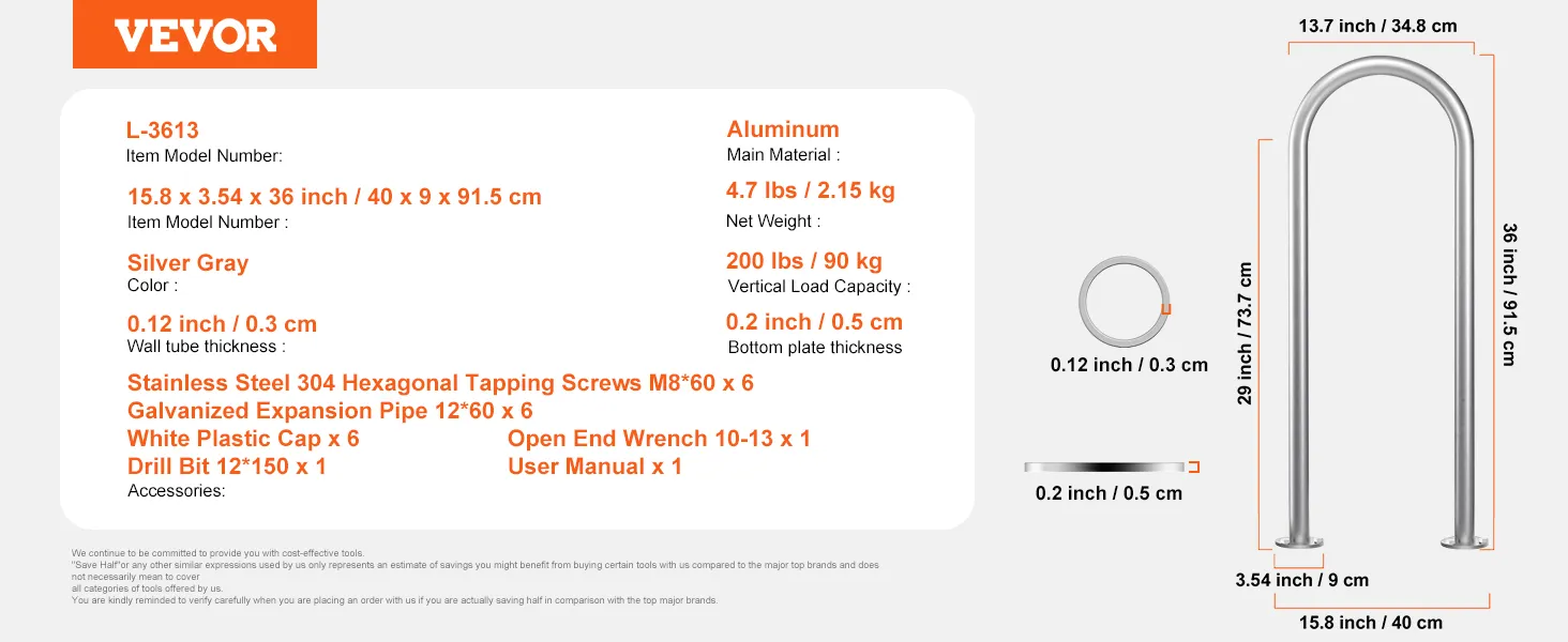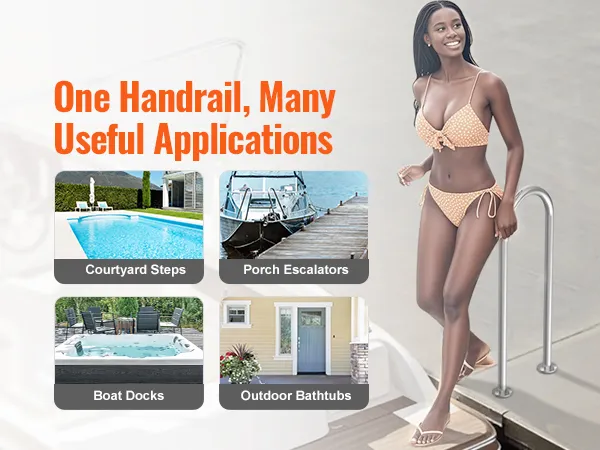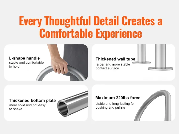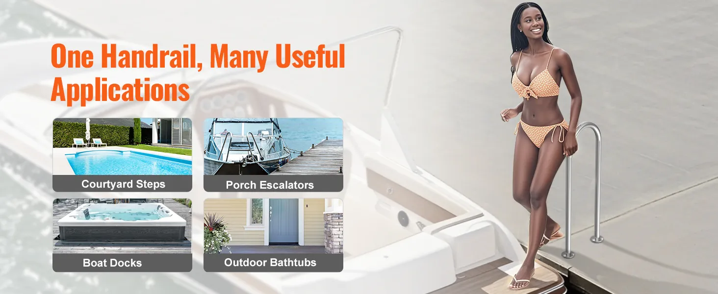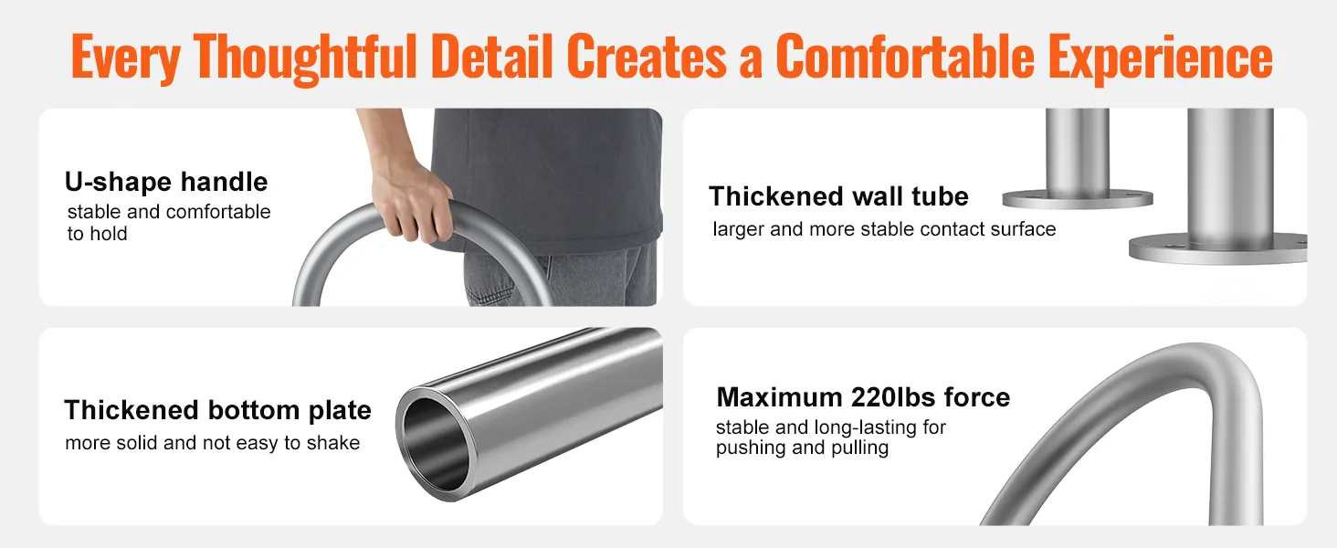 Stable Structure: The unique inverted U-shaped design allows for a secure grip when boarding or disembarking. With a large contact area and comfortable, non-slip grip, it offers reliable support while occupying minimal space. Elegant and Functional: This pool safety rail is not only robust but also features a sleek silver-gray finish that blends beautifully with any environment, enhancing safety and aesthetics whether by an outdoor bathtub or on a porch