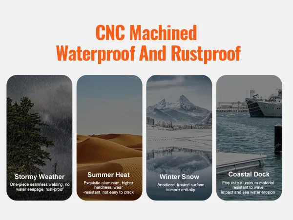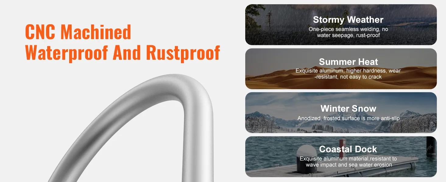 CNC Precision-Machined Aluminum Handrail: Our aluminum handrails utilize CNC precision machining for durability, easily withstanding wave impacts. Anodized for UV protection, they resist deformation and feature precise welding, making them ideal for outdoor pools and docks.