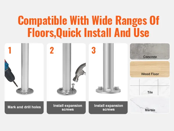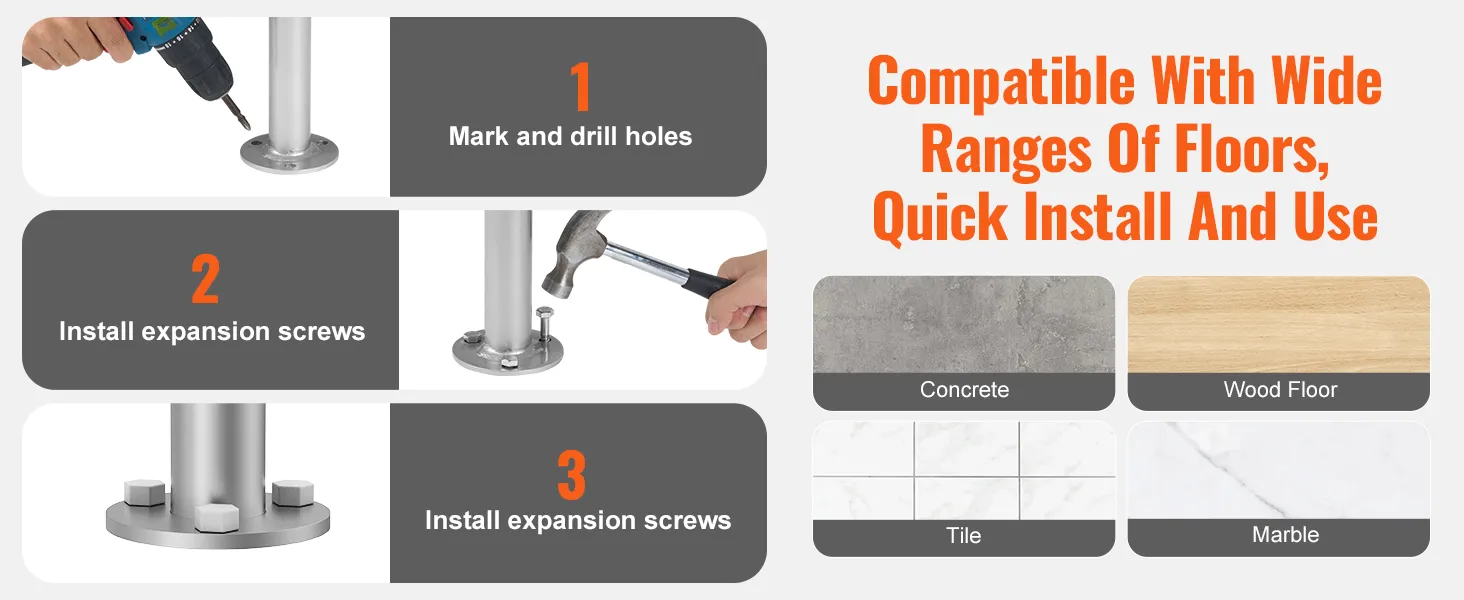 Easy Assembly: We provide a complete set of installation tools. Whether on concrete, wood, tile, or marble, you can set it up in just three steps. All necessary components, including an open-end wrench and drill bits, are included for effortless installation.