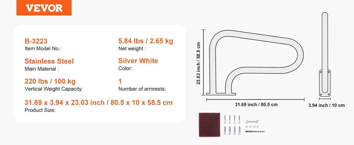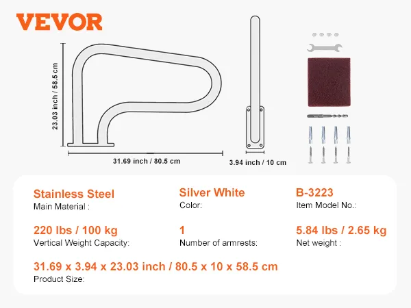 VEVOR Pool Handrail, 32 x 23 inch Pool Railing, Stainless Steel with Base Plate for Indoor/Outdoor Pools,Swimming Pool Safety Railing for Decks,Rust-Proof Grab Bar w/ Grip Cover&Accessories for Spas