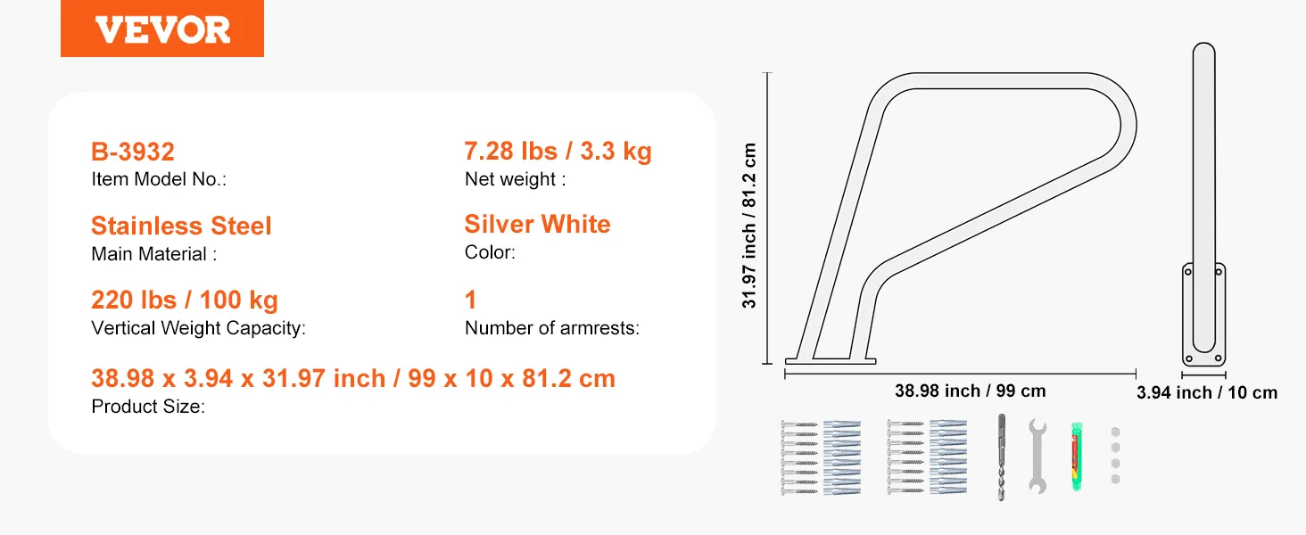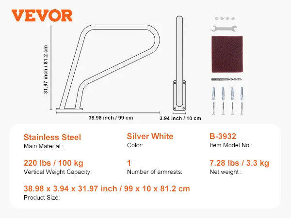 VEVOR zwembadleuning, 990 x 100 x 812 mm, zwembadinstap, roestvrij staal met voetplaat voor binnen- en buitenbaden, zwembadinstaphulp, roestvrije handgreep met handgreepafdekking en accessoires voor spa's