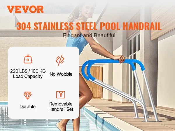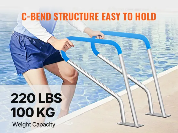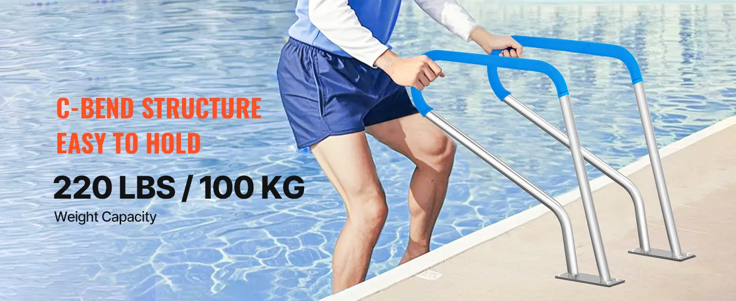 Ondersteunt tot 100 kg: met hun uitzonderlijke gewichtscapaciteit bieden onze zwembadveiligheidsrails veilige ondersteuning voor volwassenen en kinderen. Het naadloze ontwerp uit één stuk is sterk en duurzaam, met verdikte buiswanden en een basis voor extra stabiliteit.