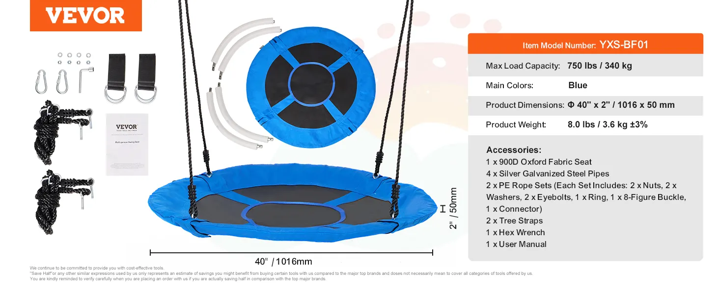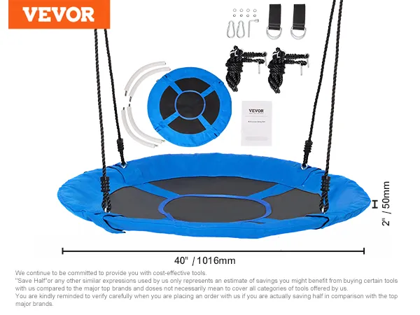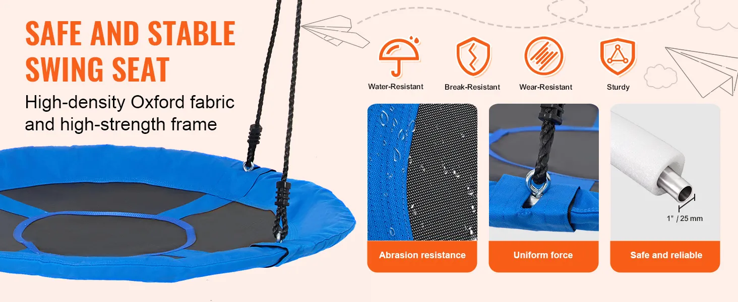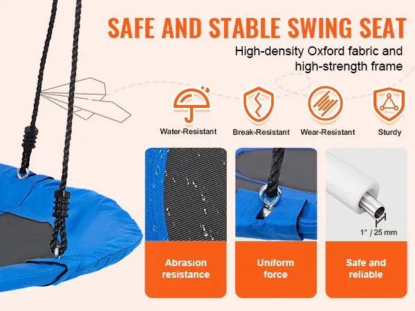 900D Blue Oxford-stof: het blauwe schommelzitje is gemaakt van 900D nylon met hoge dichtheid. Dit duurzame materiaal is stevig en bestand tegen dagelijks gebruik en slijtage buitenshuis. Het biedt een lange levensduur zonder te vervagen. De framebuizen zijn gemaakt van gegalvaniseerd staal met een zachte schuimlaag die het comfort en de veiligheid van kinderen garandeert. Het schommelzitje is bevestigd met vier gelijkmatig belaste gegalvaniseerde stalen bouten die roestbestendig zijn en de schommel stabiel houden.