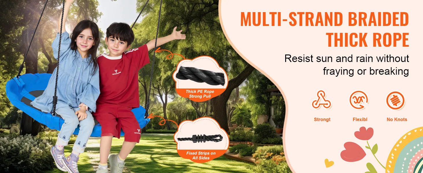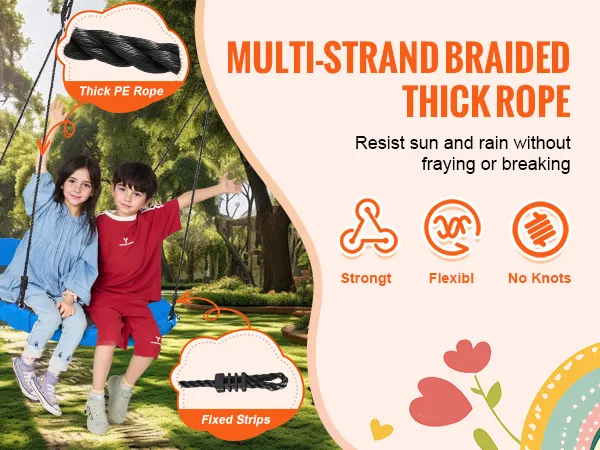 Altijd veilig opgehangen: de touwen van de boomschommel voor kinderen zijn meerstrengs gevlochten, zeer sterke PE-touwen die zacht, flexibel en knoopvast zijn. Ze verouderen of verslijten niet gemakkelijk, zelfs niet na langdurige blootstelling aan de elementen. De touwuiteinden zijn versterkt om rafelen te voorkomen. Bovendien maakt de verstelbare touwlengte een verticale hoogteverstelling mogelijk van 1,4 tot 1,8 m (4,6 tot 6 voet), geschikt voor de meeste ophanghoogtes.