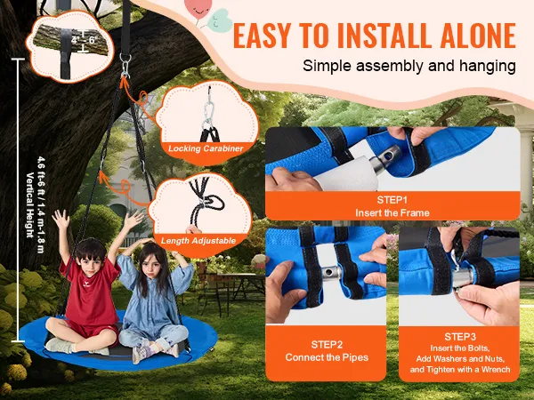 Inclusief ophangaccessoires: De buitenschommel voor kinderen wordt geleverd met twee versterkte schommelriemen van 1 meter en stevige gegalvaniseerde karabijnhaken om de schommel veilig en gemakkelijk aan boomtakken te bevestigen (bij voorkeur met een diameter van 4-6 inch). . De montage is eenvoudig en kan zelf worden gedaan.
