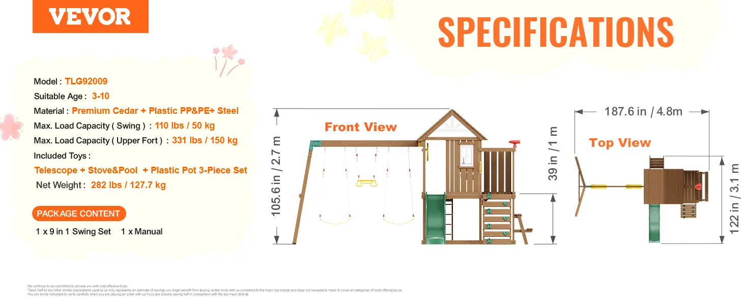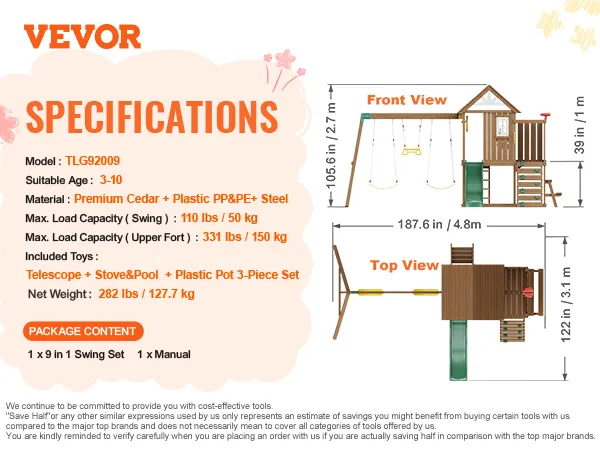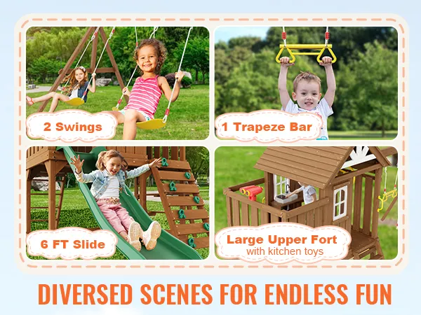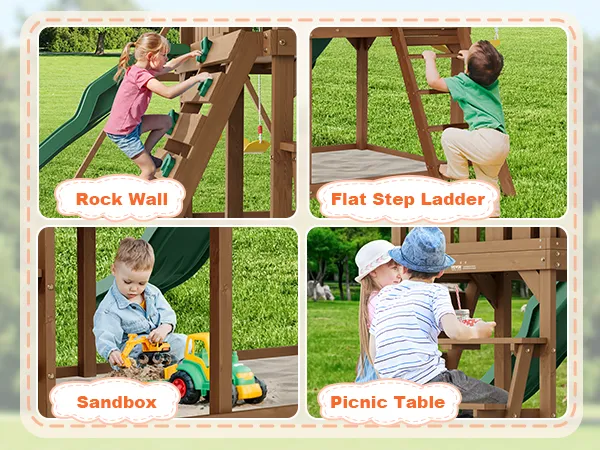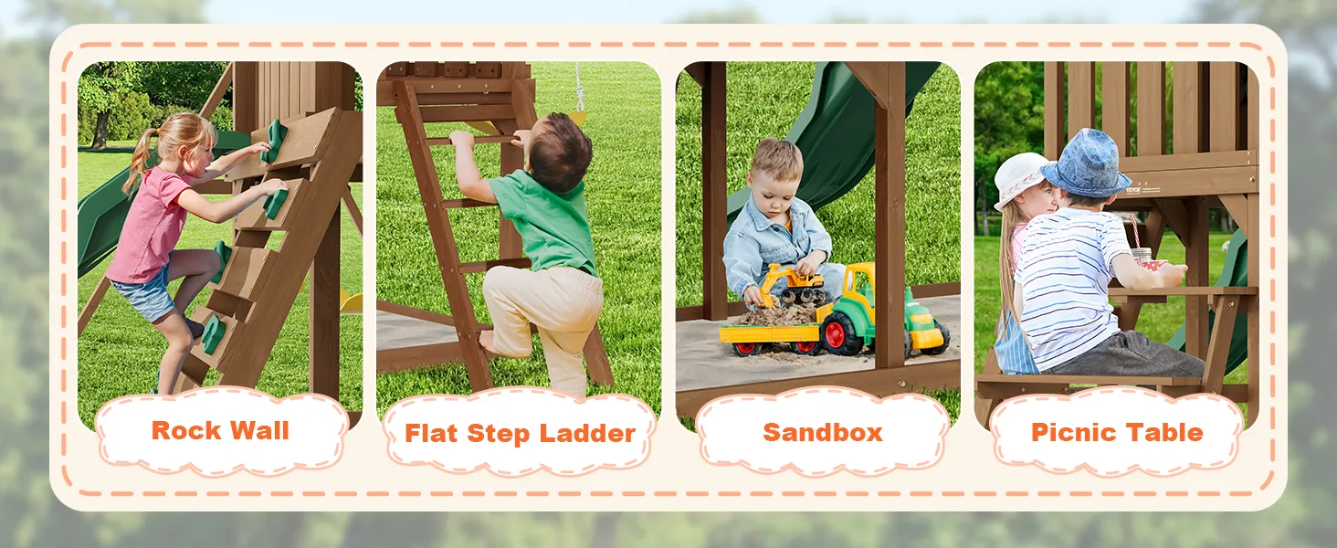 9-in-1 tuinschommels: onze alles-in-één houten schommel biedt eindeloos plezier en avontuur met zijn veelzijdige functies. Het bevat twee verstelbare schommels, een trapezestang, een glijbaan van 1,8 m, een fort met keukenspeelgoed, een zandbak (zand niet inbegrepen), een klimmuur, een platte ladder en een picknicktafel.