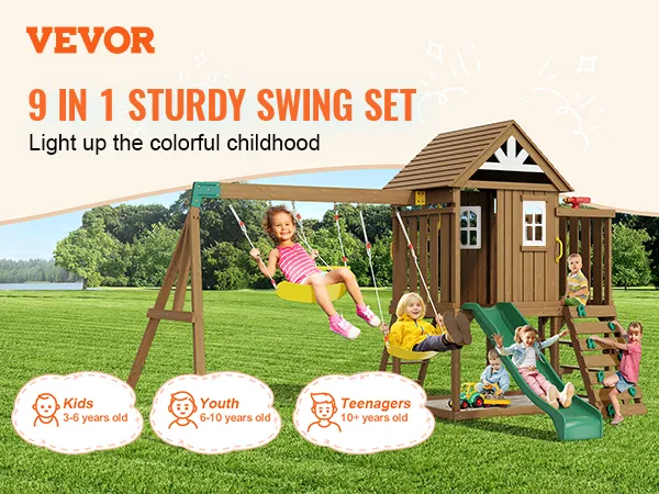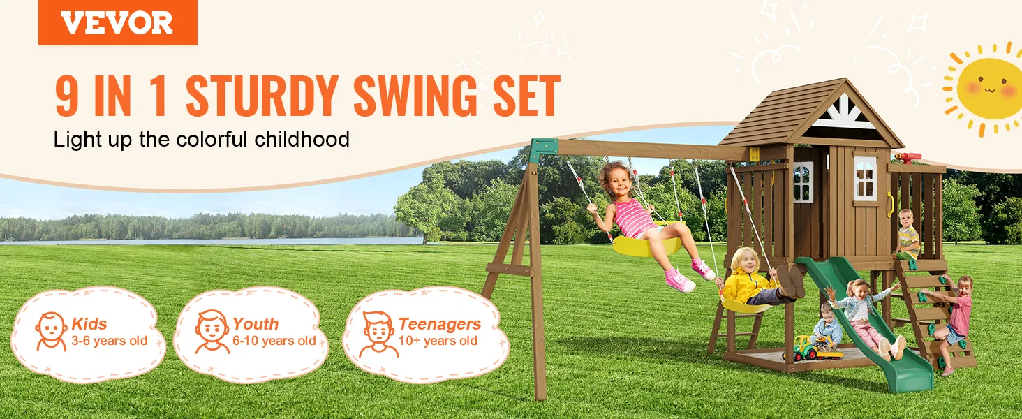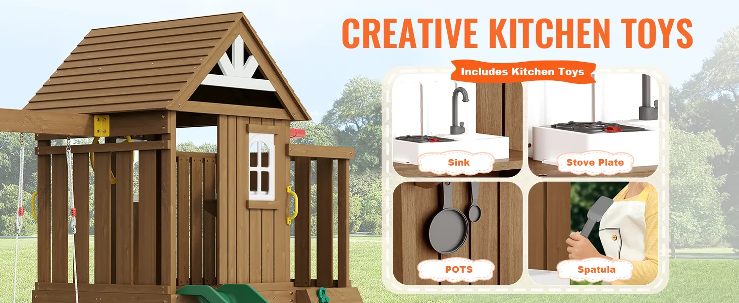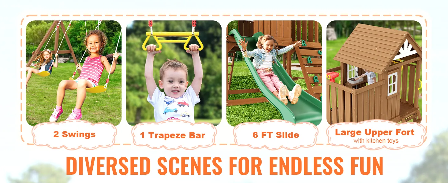VEVOR Houten Schommelset, 9-in-1 Speeltuinsets voor Buitentuin, 2 Schommels, Trapezebar, Glijbaan van 1,8 m, Groot Bovenfort met Keukenspeelgoed, Platte Trapladder, Klimwand, Picknicktafel