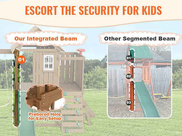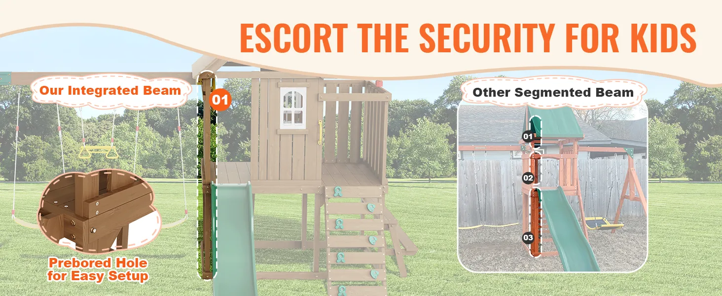 Stabiel frame: Veiligheid en stabiliteit hebben de hoogste prioriteit bij ons schommelontwerp. De constructie wordt ondersteund door de geïntegreerde balk, die voor robuuste ondersteuning en stabiliteit zorgt. Het bovenste fort biedt plaats aan maximaal 5 kinderen met een draagvermogen van 150 kg, waardoor het een betrouwbare keuze is voor energiek spelen.