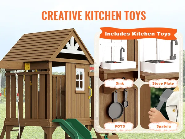 Speciaal keukenspeelgoed: Stimuleer creatief rollenspel met ons unieke keukenspeelgoed dat in het fort zit. De tuinspeelset bestaat uit een gootsteen, kookplaat, potten en spatel, waardoor de speelervaring wordt vergroot en kinderen hun creativiteit kunnen ontdekken in een speelse omgeving.