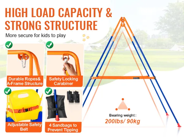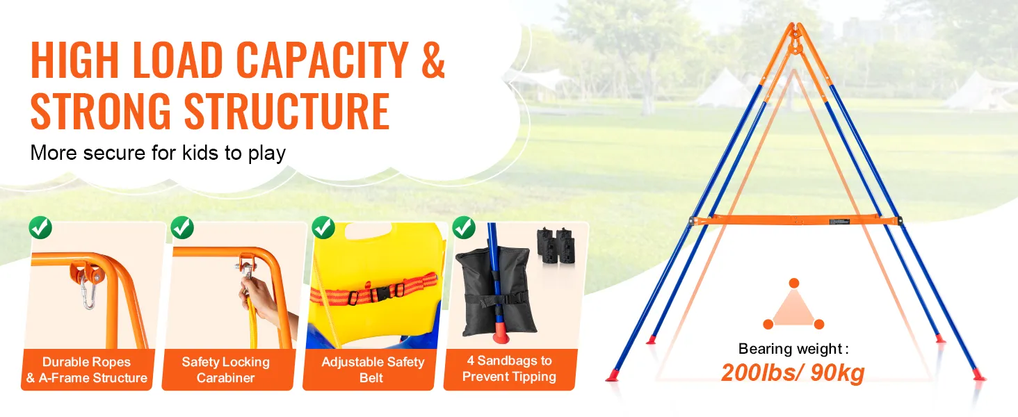 High Weight Capacity & Sturdy Construction: Equipped with 4 sandbags, each holding 11 pounds, this A-frame swing set enhances stability to prevent tipping over. It features a durable triangular support structure made from robust extendable steel, ensuring stability and durability.