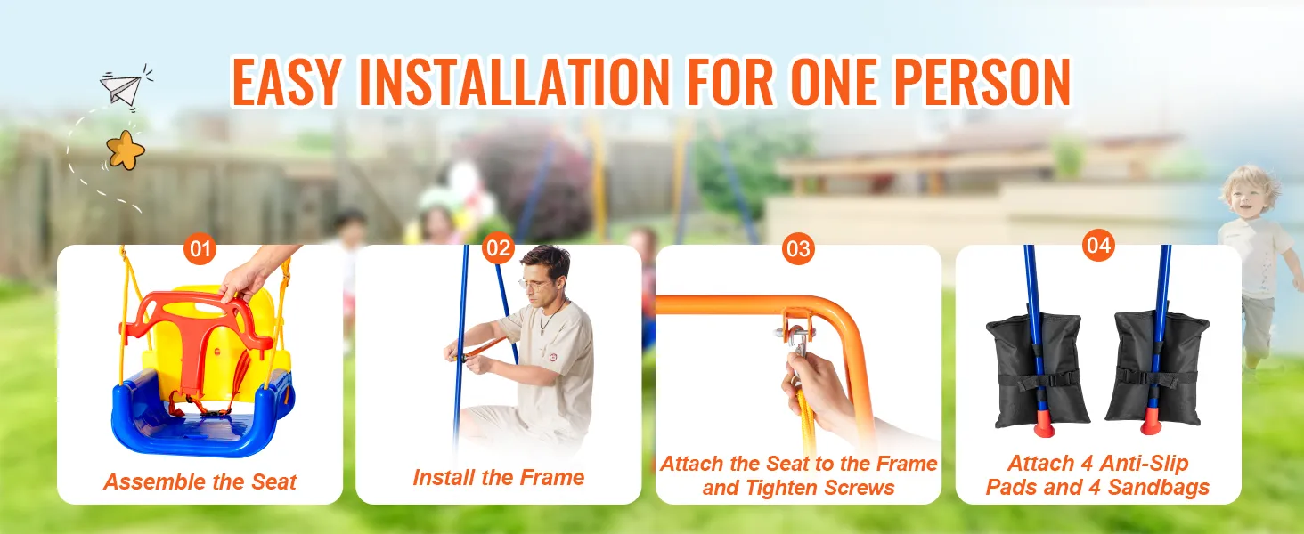 The swingset outdoor for kids comes with clear, detailed instructions for easy assembly, making it a delightful family activity. The foldable metal frame facilitates storage.